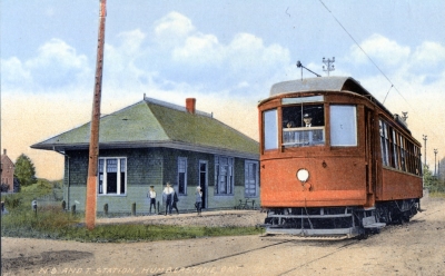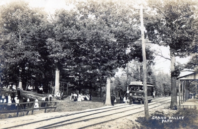 from the Paris, ON museum: The Grand Valley Electric Railway ran through Paris from Preston (now part of Cambridge) to Port Dover. South of Paris the Grand Valley Electric Railway line ran parallel to the Grand Trunk/CNR line. In the postcard you can see one of the trolley cars about to stop and pick up and let off passengers at Grand Valley Park. Grand Valley Park was between Brantford and Paris at the end of Oak Park Road near the bank of the Grand River.