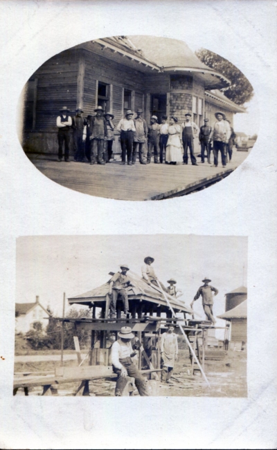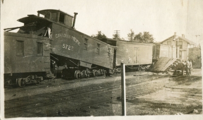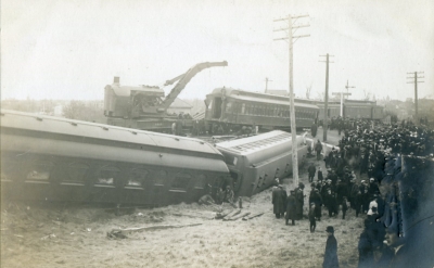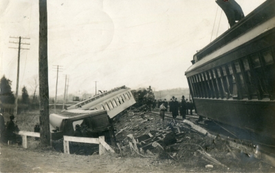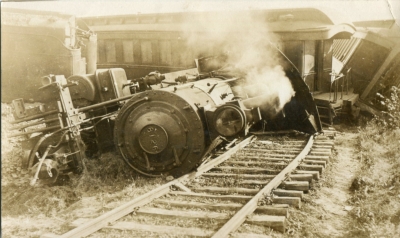 Divided, message notes 'wreck near here' cancelled Woodstock 1906, imprinted with Woodstock Studio logo. WJ Rounds?.
