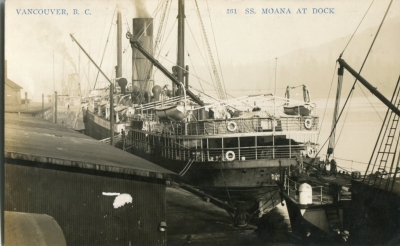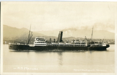'Copyright F GOWEN 1907' on front. Divided, message, not posted. Built by A. Stephen & Son, Glasgow in 1908. At 137 metres in length and with a twin-screw steam engine, she was capable of a speed of 16 knots and could carry 402 passengers. The Makura remained in service for 28 years on the trans-Pacific run, steaming over 2.3 million nautical miles. She was sold to Chinese ship-breakers in 1936.