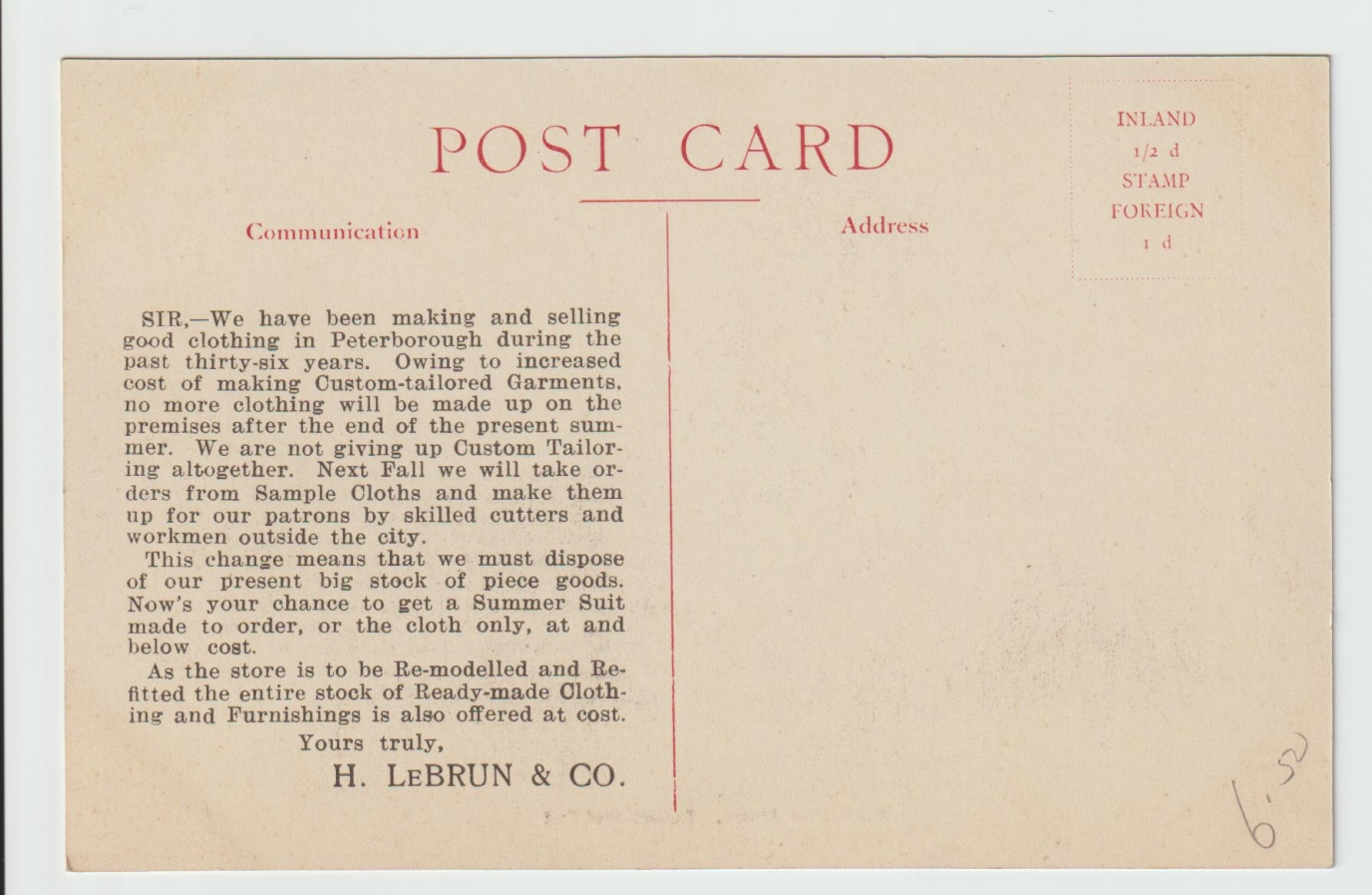 Left side filled with advertising for "H LeBRUN & Co" clothiers, Peterboro.  (see 2nd scan) Divided, unused, good condition.