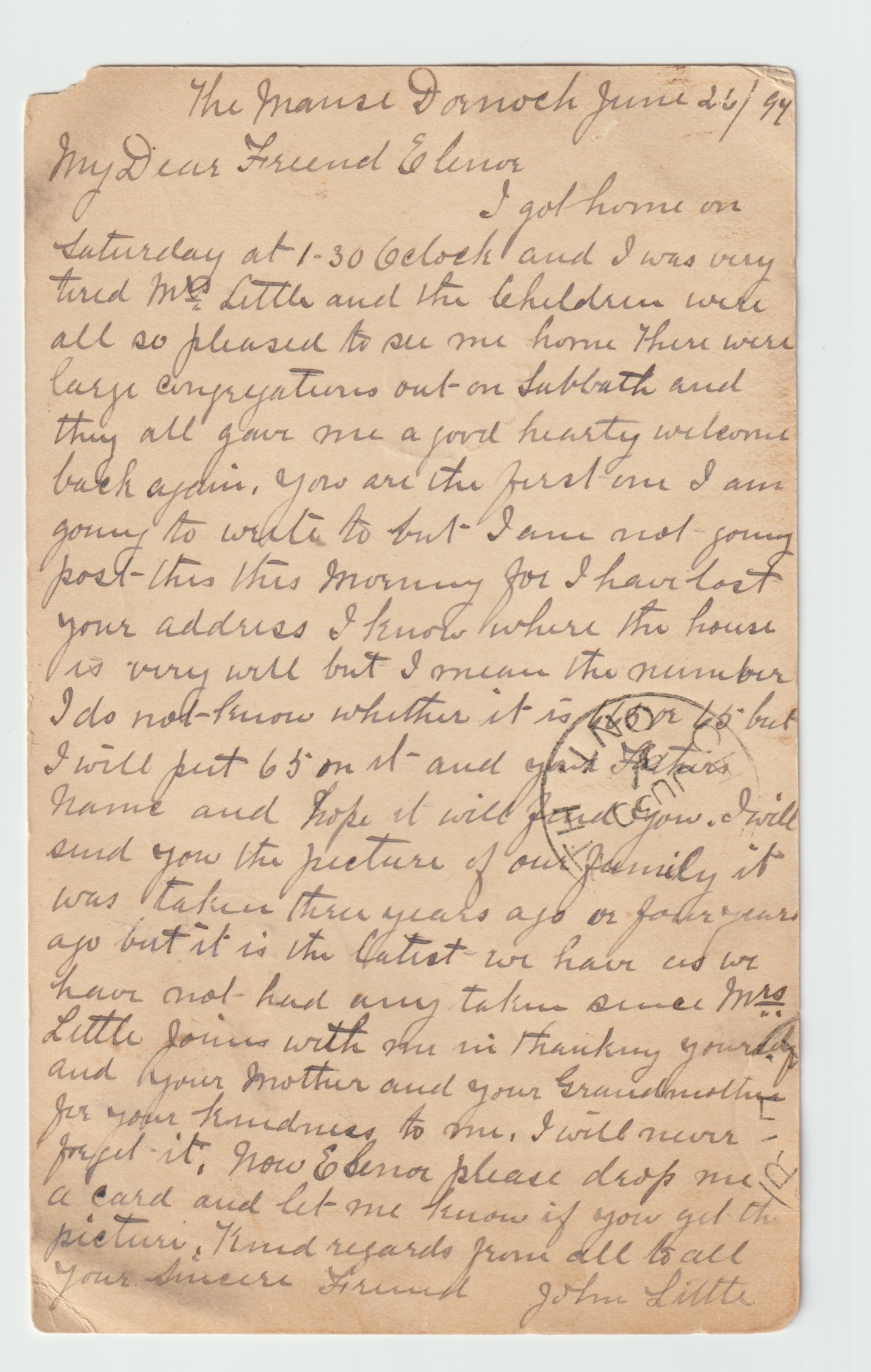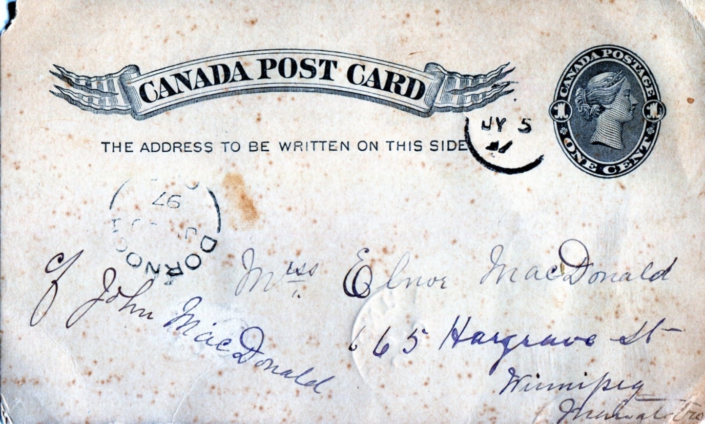 Message (see 2nd scan)  from 'the Manse' from John Little about family activities, sent to Winnipeg.  Somewhat grimy, one corner torn. (validation here)