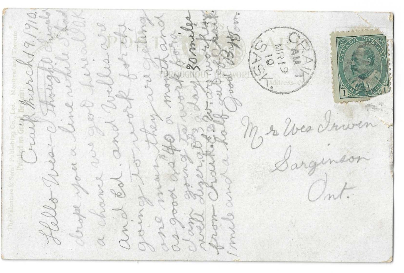 LITHO 1910 circle cancel CRAIK Sask ID 10
